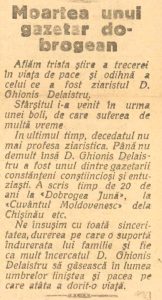 „Aflăm trista știre a trecerii în viața de pace și odihnă a celui ce a fost ziaristul D. Ghionis Delaistru… Până nu de mult însă D. Ghionis Delaistru a fost unul dintre gazetarii constănțeni conștiincioși și entuziaști. A scris 20 de ani la „Dobrogea Jună”, la „Cuvântul Moldovenesc” de la Chișinău, etc. …Dorim ca în lumea umbrelor să își găsească pacea pe care atât a dorit-o în viață.[16]”