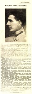 „Cel mai temut și apreciat comisar Regal, Maiorul Vasile D. Chiru a debutat în viața publică ca ziarist, fiind redactor la „Adevărul” și la „Minerva”, colaborând cu principalele ziare și publicațiuni ale timpului. Maiorul Vasile D. Chiru s-a născut în anul 1887, deci e în floarea vârstei, energiei și talentului. Făcându-și stagiul militar, a fost sedus împreună cu alți tineri de elită de frumusețea vieții militare. De disciplină, de morală și de viața acestei cariere militare. În înalta ei menire națională, a rămas în oștire, trecând cu succes prin școala tinerilor cu termen redus, fondată în 1909 de Generalul Averescu, școală care a dat o întreagă pleiadă de militari cari înregistrează astăzi armata. Tânărul entuziast care s-a devotat armatei dintr-o adâncă convingere și din cel mai pur idealism a fost un fruntaș al clasei sale, fiind clasificat al treizeci și optulea dintr-o promoție de 240 de ofițeri. Maiorul Vasile D. Chiru a făcut din postul său un excelent instrument de purificare, prin mijloace câștigate, reușind să se facă respectat și temut la bară, căpătând încrederea și respectul chiar al împricinaților. În cursul strălucitei sale cariere în justiția militară, pe care nu a părăsit-o nici o clipă, a instrumentat cu succes cele mai importante cazuri întâmplate în ultimul timp. Pentru meritele sale de Comisar Regal a fost citat prin Ordin de zi pe armată, decorat pentru merite profesionale cu ordinul „Steaua României” în gradul de ofițer. În prima fază a războiului, renunțând la mobilizarea sa în justiție, a luptat ca un brav, fapt pentru care a fost decorat cu ordinul „Steaua României” cu spadă și panglica „Virtutea Militară.” Orator de rasă, mânuind o vastă cultură, militar brav, Maiorul Vasile D. Chiru este și un scriitor de seamă, fiind membru al Societății Scriitorilor Români. Din opera sa fecundă și valoroasă cităm: „Criminali morali”, studiu de sociologie, „Un oftat în umbră”, nuvele, „Suflete mari”, teatru, „Când înfloresc salcâmi”, proză, „Dușmanii neamului”, studiu sociologic, „Învingătorul”, nuvele, „Trecând prin viață”, roman, etc.”