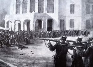 Într-o iarnă deosebit de friguroasă, după un război secătuitor în care suferința s-a manifestat prin foamete, opresiune, pierderea celor apropiați pe front, orori, etc., muncitorii bucureșteni, la întoarcerea Casei Regale de la Iași, au ieșit pe străzi și au cerut abolirea monarhiei, reducerea orelor de muncă la 8, mărirea salariilor și recunoașterea sindicatelor. Inițial au pornit doar breslele tipografilor, dar s-au adăugat și alte bresle, estimându-se că pe străzi au ieșit circa 15 000 de oameni. Greva a fost înăbușită violent de către autoritățile române, represiunea soldându-se cu moartea și rănirea a zeci de muncitori al căror număr nu se cunoaște concret nici azi. Armata română, adusă în capitală pentru intervenție, a deschis focul asupra manifestanților, chiar în fața Teatrului Național. Acolo au fost arestați zeci de manifestanți, care au fost ulterior bătuți și maltratați. Printre ei, fruntașul socialist I. C. Frimu, a murit la câteva zile de la rănile provocate de bătaie.