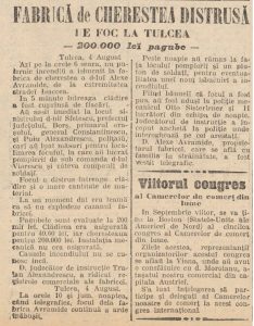 „Tulcea, 4 august. Azi, pe la orele 6 seara, un puternic incendiu a izbucnit la fabrica de cherestea a d-lui Alexe Avramide, de la extremitatea străzii Isaccea. În 5 minute, întreaga clădire a fost cuprinsă de flăcări. Au sosit imediat la locul sinistrului d-nii Sfeteșcu, prefectul județului, Borș, primarul orașului, general Constantinescu și Puiu Alexandrescu, polițaiul, care au luat măsuri pentru localizarea focului, la care au lucrat pompierii de sub comanda d-lui Voiorescu și câteva companii de soldați. Focul a distrus întreaga clădire și o mare cantitate de material. La un moment dat era teamă să nu explodeze cazanul fabricii. Pagubele sunt evaluate la 200 mii lei. Clădirea era asigurată pentru 40.000 lei, iar cheresteaua pentru 200.000 lei. Instalația mecanică nu era asigurată. Cauzele incendiului nu se cunosc încă”.